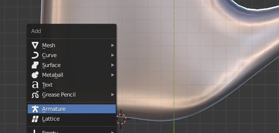 Now, let’s make the hand do something interesting. Move the 3D cursor to the base of the hand (Shift+Right Click). Add an Armature. Move the root bone so that it is entirely outside of the hand. Extrude (E) the rest of the bones, lining them up as best you can to hand joints. Exit Edit Mode, select the hand, Shift+select the armature, and press Ctrl+P to set the hand’s parent to the armature. Select Add Automatic Weights.