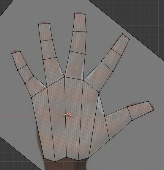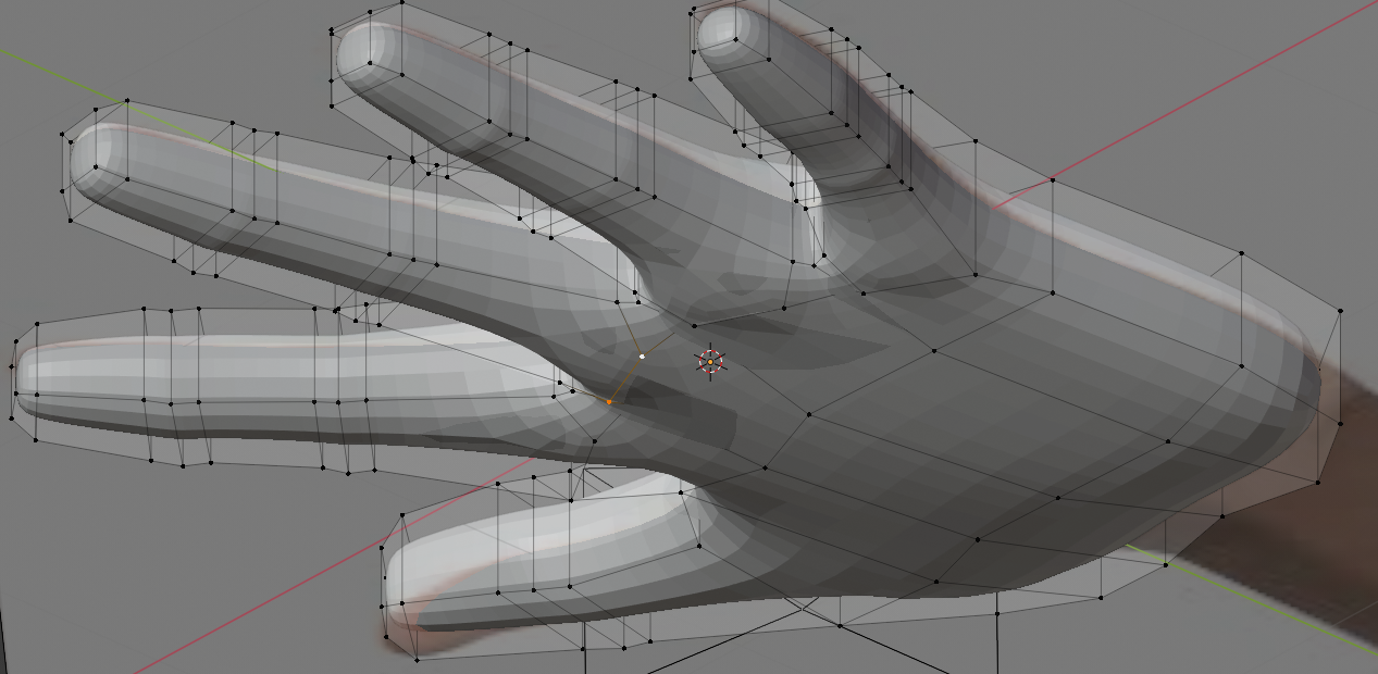 We need to add a little more geometry to everything. Select the knuckle edge loops and Bevel them. Using the Knife tool (on Cut Through mode), add two lines across the palm. Delete the face between the thumb and pointer finger, then create new faces with the Fill tool (F). Finesse everything again, along all 3 axes. It’s still going to look boxy, but we are about to fix that.