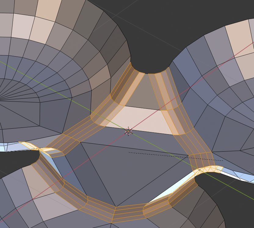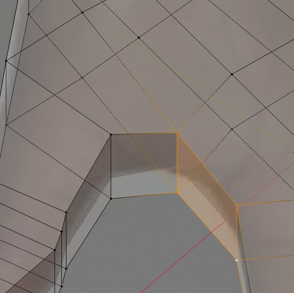 Select any harsh edges, and press Ctrl+B to Bevel them. Spin the scroll wheel up a few ticks for more bevel steps. Similarly to when we inset faces, if the bevel causes self-intersecting faces, you will need to merge the guilty vertices.